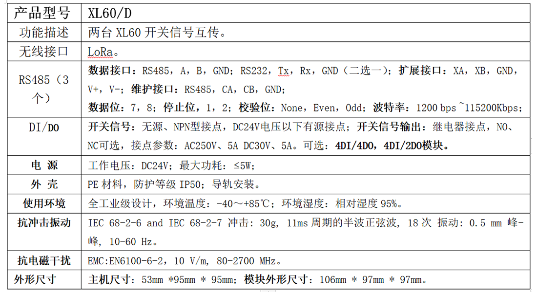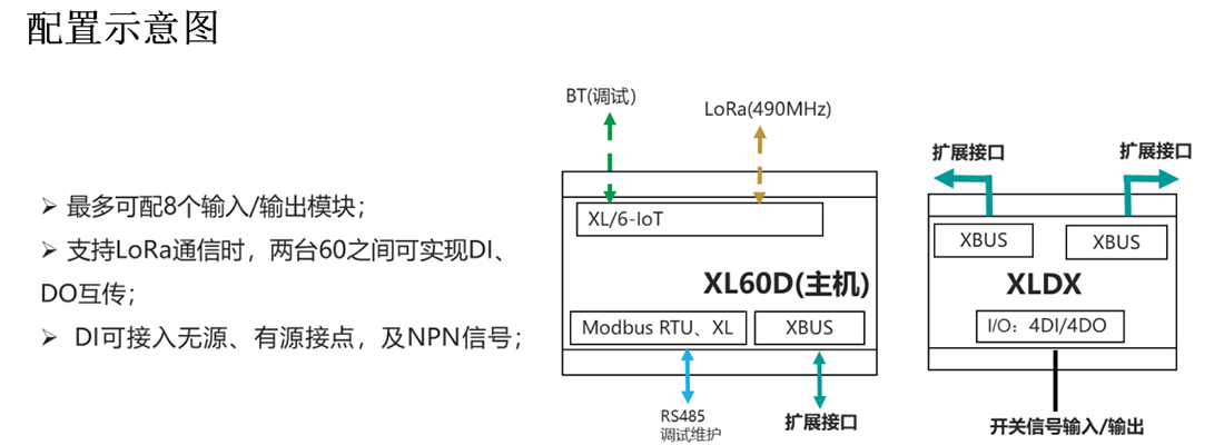 XL60D的通信方式是LoRa無(wú)線傳輸方式,每臺(tái)XL60D主機(jī)模塊,最多配兩個(gè)開關(guān)量I/O模塊。