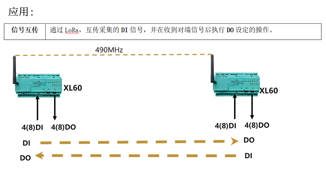無(wú)線開關(guān)量對(duì)傳模塊XL60D,由一對(duì)XL60D采集模塊組成,從一端模塊輸入的開關(guān)信號(hào),無(wú)線對(duì)傳到另一端輸出開關(guān)信號(hào)。開關(guān)信號(hào)是一對(duì)一的輸入、輸出,DO隨著對(duì)應(yīng)DI的變化而變化。
