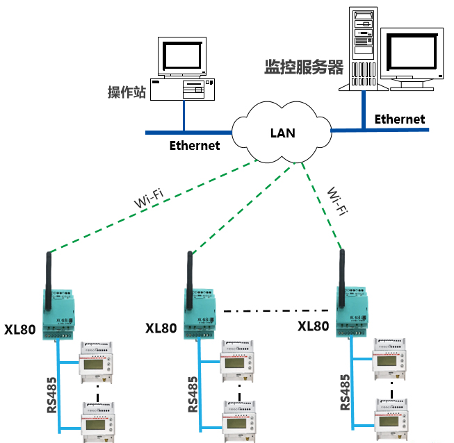 1、安裝在配電柜(控制柜)的電能表,通過RS485總線接入XL80智能主機(jī);建議同一面(如)柜內(nèi)的電能表,配置1臺(tái)XL80智能主機(jī),智能主機(jī)也安裝在配電柜內(nèi);