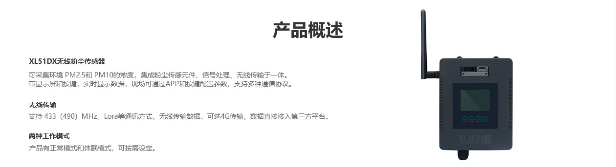 XL51DX無線粉塵傳感器,采集環(huán)境 PM2.5和 PM10的濃度,集成粉塵傳感元件、信號處理、無線傳輸于一體。帶顯示屏和按鍵,實時顯示數(shù)據(jù),現(xiàn)場可通過APP和按鍵配置參數(shù),支持多種通信協(xié)議。