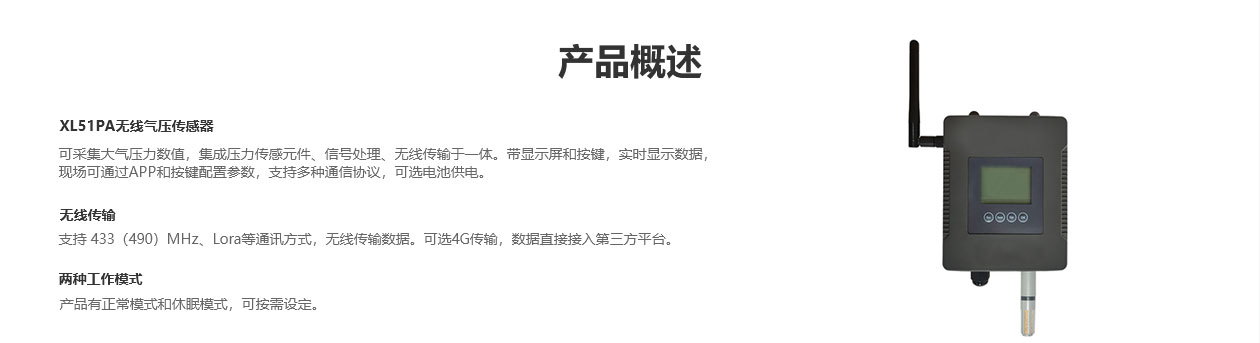 XL51PA無線氣壓傳感器,可采集大氣壓力數(shù)值,集成壓力傳感元件、信號(hào)處理、無線傳輸于一體。帶顯示屏和按鍵,實(shí)時(shí)顯示數(shù)據(jù),現(xiàn)場(chǎng)可通過APP和按鍵配置參數(shù),支持多種通信協(xié)議。
