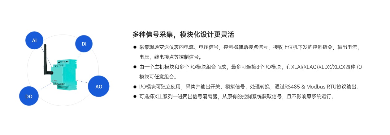 XL60無線采集模塊,采集模擬、開關(guān)信號,輸出模擬、開關(guān)信號,可選多種無線通訊方式。模塊化設(shè)計,更方便擴展輸入、輸出數(shù)量。