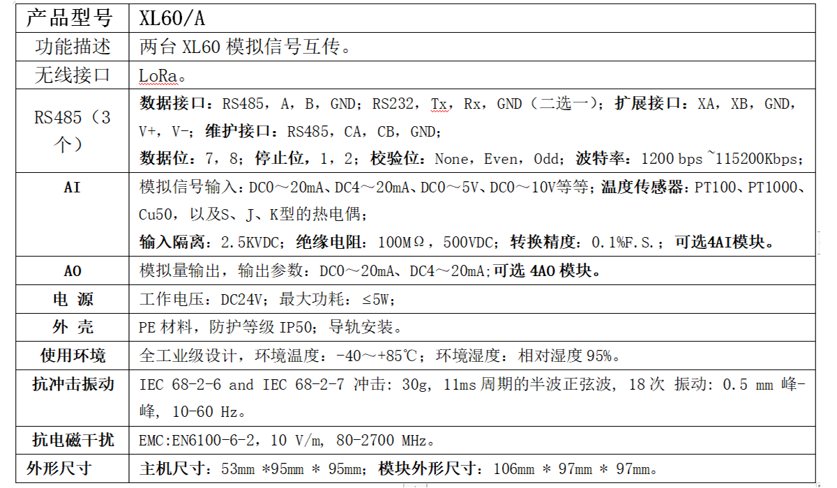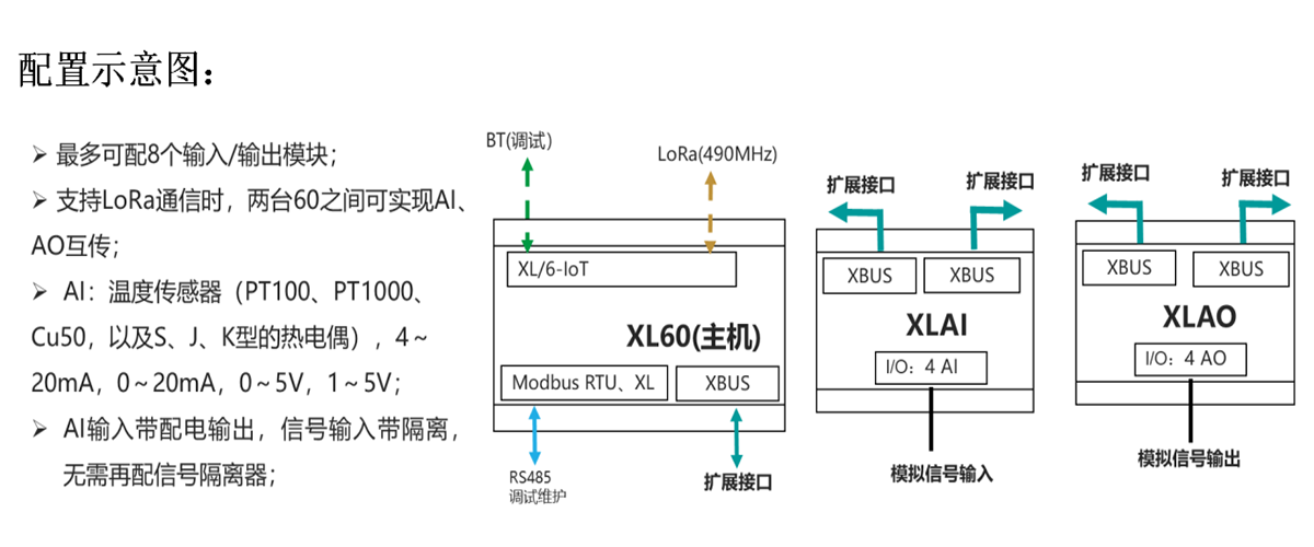 XL60A采用LoRa無線通信方式,每臺XL60A主機(jī)模塊,最多配兩個模擬量I/O模塊。