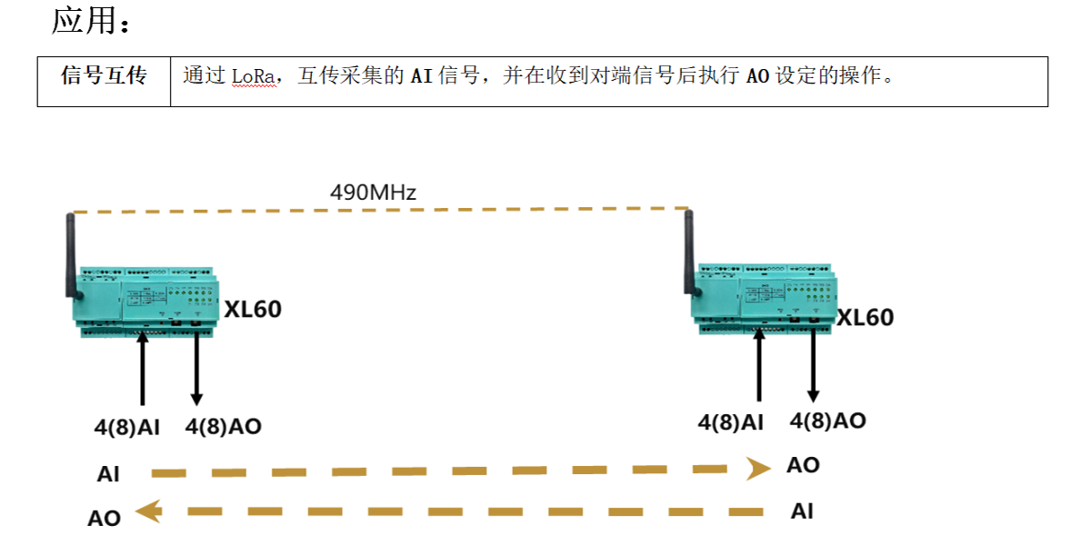 無線模擬量對傳模塊XL60A,由一對XL60A采集模塊組成,在一端的模塊輸入模擬信號,無線對傳到另一端輸出模擬信號,實(shí)現(xiàn)模擬信號一對一的輸入、輸出,AO隨著AI的變化而變化。