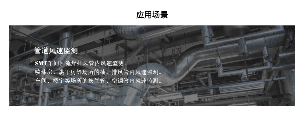 SMT車間回流焊排風管內風速監(jiān)測。 噴漆房、烘干房等場所的抽、排風管內風速監(jiān)測。 車間、樓宇等場所的換氣管、空調管內風速監(jiān)測。