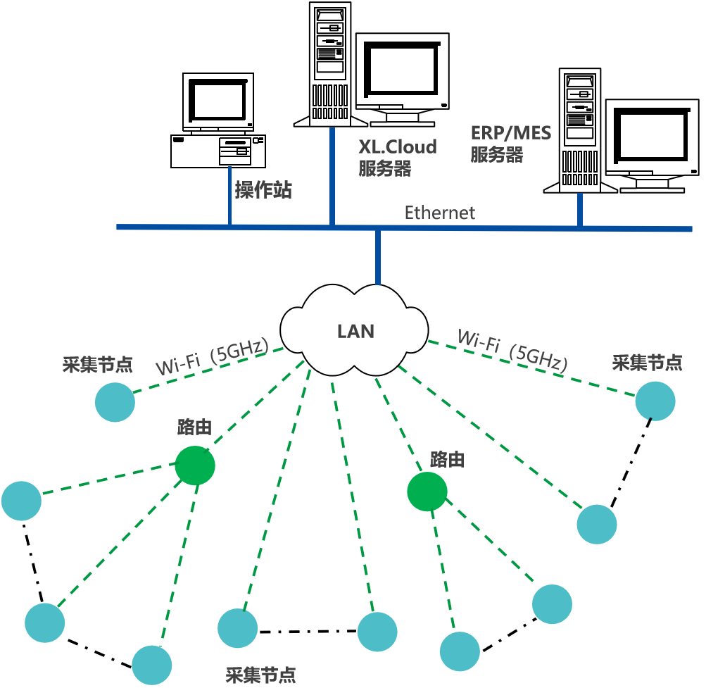 采集節(jié)點(diǎn)裝置(智能轉(zhuǎn)換器、智能主機(jī)),通過Wi-Fi(5GHz),接入LAN,推送機(jī)器運(yùn)行數(shù)據(jù),至企業(yè)生產(chǎn)管控服務(wù)器