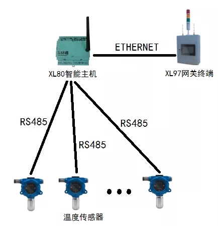 我司低溫檢測監(jiān)測系統(tǒng),選用XL97網(wǎng)關(guān)終端。通過采用RS485線的方式將各監(jiān)測點(diǎn)的數(shù)據(jù)傳輸至XL80智能主機(jī),智能主機(jī)再通過ETHERNET方式將數(shù)據(jù)上傳至XL97網(wǎng)關(guān)終端,網(wǎng)關(guān)終端將傳來的數(shù)據(jù)進(jìn)行分析處理后,直觀的將監(jiān)測點(diǎn)的實(shí)時溫度值顯示出來。