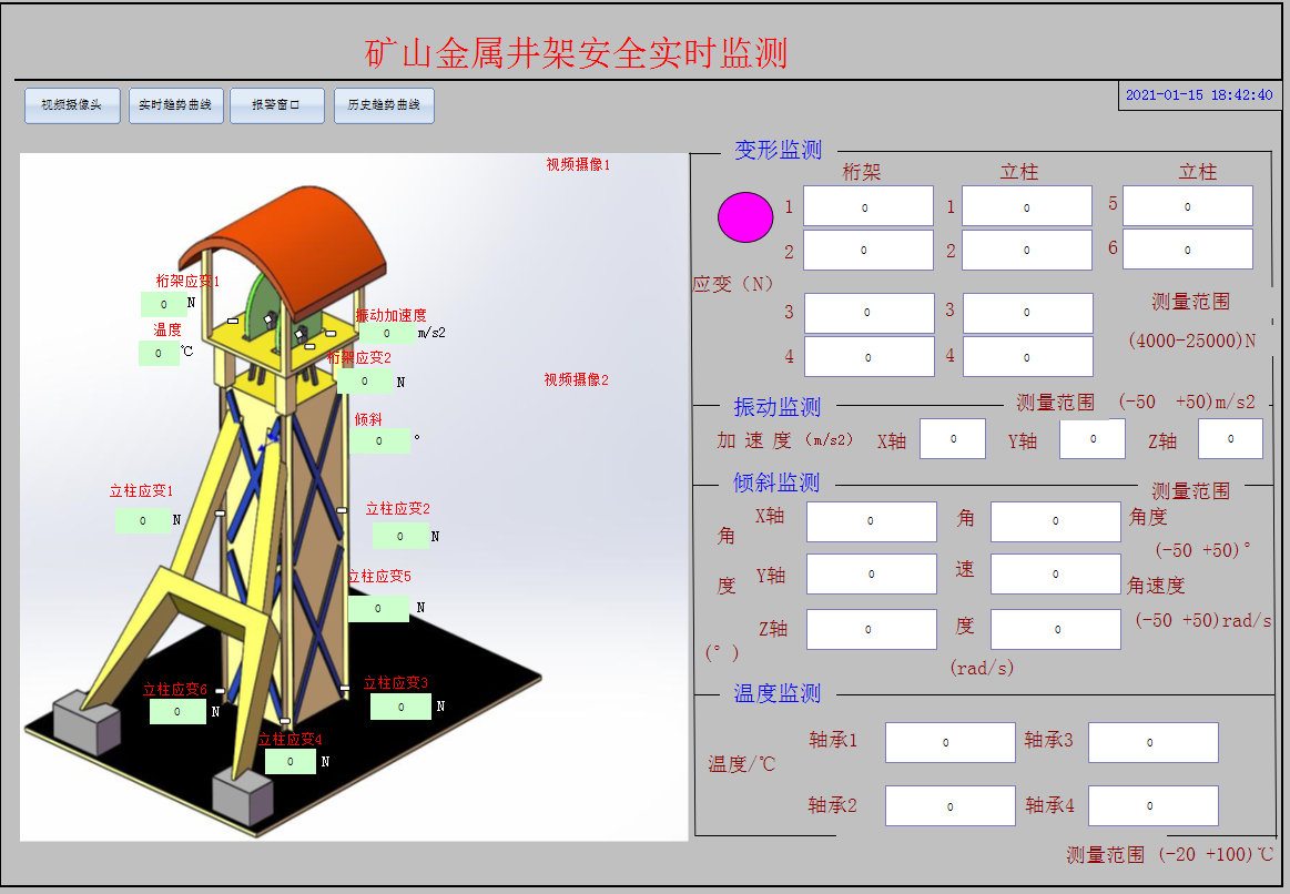 基于XIoT技術(shù)的煤礦井架安全實(shí)時(shí)監(jiān)測系統(tǒng),實(shí)時(shí)監(jiān)測井架環(huán)境參數(shù)。當(dāng)參數(shù)異?;虺霈F(xiàn)險(xiǎn)情時(shí),中控室發(fā)出報(bào)警聲提醒工作人員。 1)需提供攝像頭實(shí)時(shí)監(jiān)測井架周邊情況 ; 2)實(shí)時(shí)監(jiān)測井架受力情況、振動情況、傾斜情況及軸承溫度情況; 3)PC界面可實(shí)時(shí)查看數(shù)據(jù)信息,數(shù)據(jù)存儲不少于180天。監(jiān)控系統(tǒng)簡述: