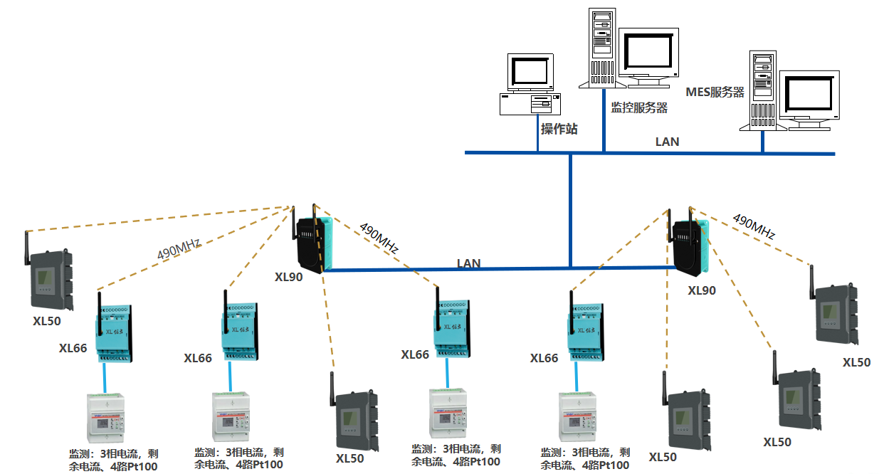 4、所有采集的數(shù)據(jù)通過(guò)無(wú)線Lora上傳給物聯(lián)網(wǎng)關(guān)XL90,然后網(wǎng)關(guān)通過(guò)以太網(wǎng)或者WIFI5G)把數(shù)據(jù)傳給MES系統(tǒng)。