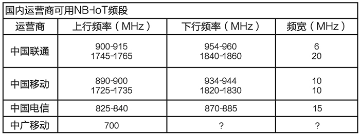 NB-IoT使用了授權(quán)頻段,有三種部署方式:獨(dú)立部署、保護(hù)帶部署、帶內(nèi)部署。全球主流的頻段是800MHz和900MHz。中國(guó)電信會(huì)把NB-IoT部署在800MHz頻段上,而中國(guó)聯(lián)通會(huì)選擇900MHz來(lái)部署NB-IoT,中國(guó)移動(dòng)則可能會(huì)重耕現(xiàn)有900MHz頻段。具體如表所示: