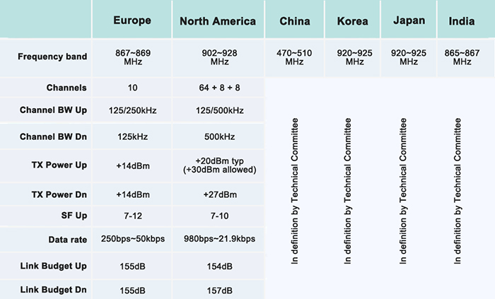 LoRa使用的是免授權(quán)ISM頻段,但各國(guó)或地區(qū)的ISM頻段使用情況是不同的。在中國(guó)市場(chǎng),由中興主導(dǎo)的中國(guó)LoRa應(yīng)用聯(lián)盟(CLAA)推薦使用了470-518MHz。而470-510MHz這個(gè)頻段是無(wú)線電計(jì)量?jī)x表使用頻段。由于LoRa是工作在免授權(quán)頻段的,無(wú)需申請(qǐng)即可進(jìn)行網(wǎng)絡(luò)的建設(shè),網(wǎng)絡(luò)架構(gòu)簡(jiǎn)單,運(yùn)營(yíng)成本也低。LoRa聯(lián)盟正在全球大力推進(jìn)標(biāo)準(zhǔn)化的LoRaWAN協(xié)議,使得符合LoRaWAN規(guī)范的設(shè)備可以互聯(lián)互通。下圖是LoRa聯(lián)盟規(guī)范里提到的部分使用頻段:
