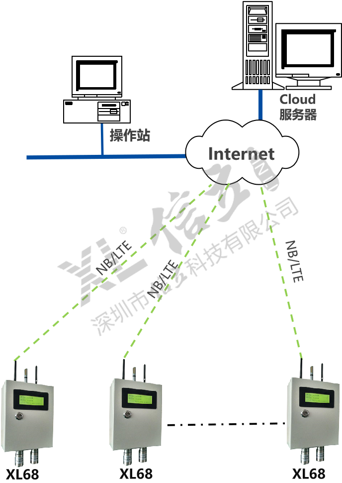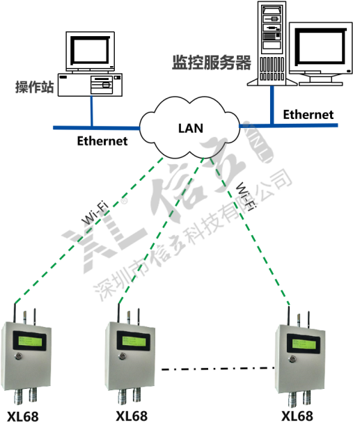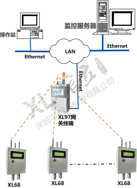 如增加現(xiàn)場集中監(jiān)控點,可配置XL97網(wǎng)關(guān)終端,讀取區(qū)域內(nèi)XL68上傳的數(shù)據(jù),分析處理、顯示、報警,并轉(zhuǎn)發(fā)至監(jiān)控中心服務(wù)器。