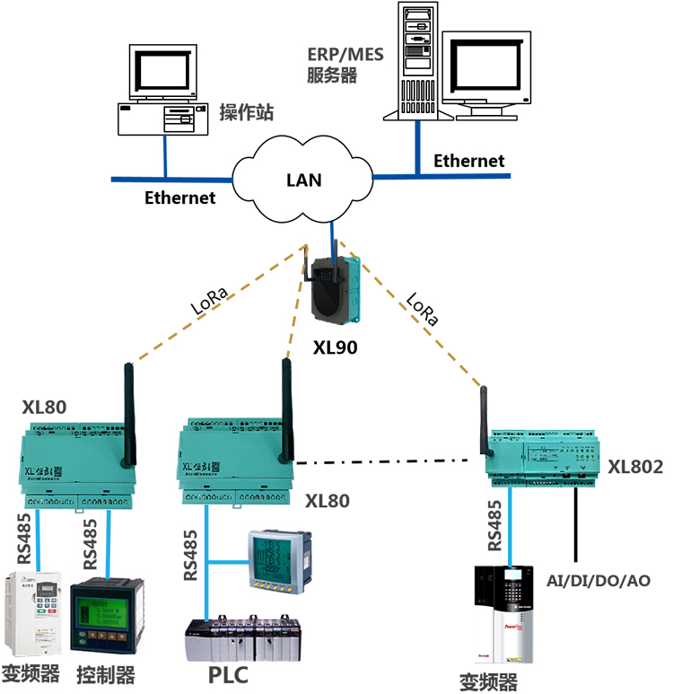 對采集點(diǎn)數(shù)據(jù)量小,需要Ethernet、RS485、CAN、USB 等通信接口讀取數(shù)據(jù),要聯(lián)接多臺(tái)設(shè)備,選擇XL80智能主機(jī),配置LoRa通信。