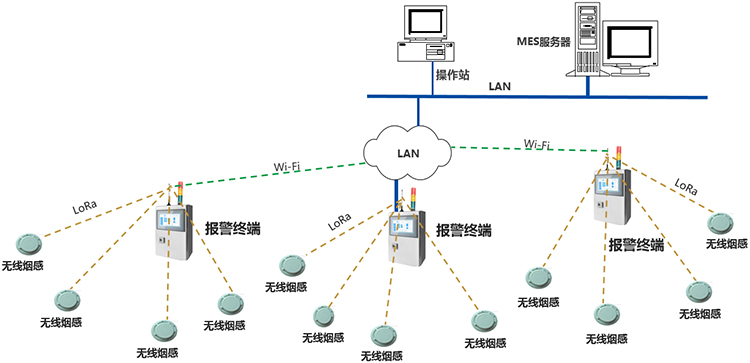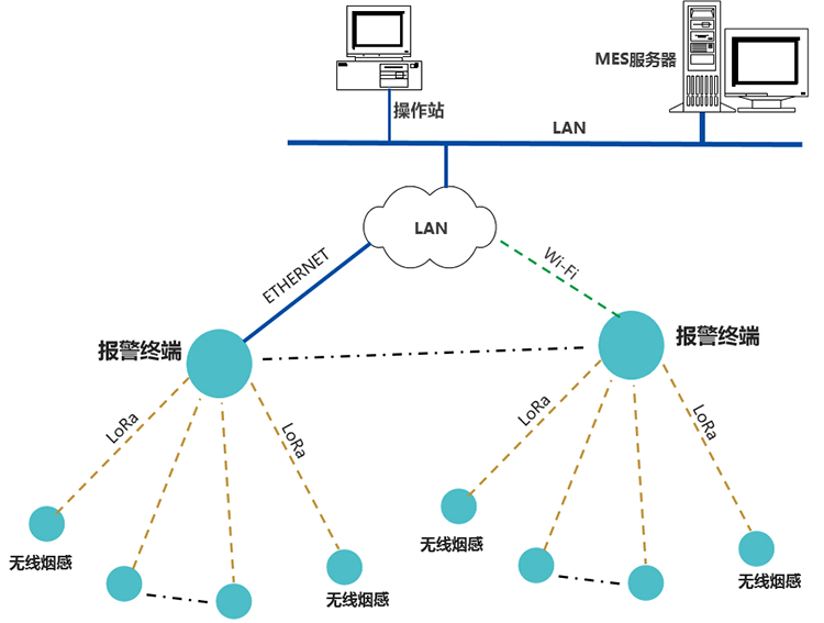 報(bào)警終端通過無線,獲取管轄區(qū)域內(nèi),煙感監(jiān)測點(diǎn)的數(shù)據(jù),通過ETHERNET,或Wi-Fi,推送數(shù)據(jù)至工廠MES服務(wù)器,通信協(xié)議為工廠MQTT數(shù)據(jù)格式。
