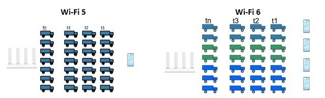 我們可以將路由器向設(shè)備傳輸?shù)膱鼍氨扔鞒梢粋€車隊,在WiF i5標(biāo)準(zhǔn)下,同一時刻出發(fā)車隊只能派送到一個客戶,即使有空車也照常發(fā)車,如果有車出現(xiàn)故障(受干擾),整個車隊都無法發(fā)車。而在WiFi 6標(biāo)準(zhǔn)下,同一時刻出發(fā)的一個車隊,可以將相鄰的最少26輛車組成一個小隊,每個小隊可以派送到不同的客戶,如果有車出現(xiàn)故障(受干擾)只影響所在的小隊。