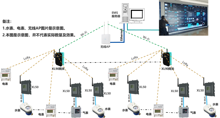 物聯(lián)網(wǎng)關通過LoRa無線讀取水、電、氣等表計的數(shù)據(jù),通過Wi-Fi推送數(shù)據(jù)至EMS(能源管理)服務器,無線AP起到橋梁作用。無線AP通過以太網(wǎng)接口,直接聯(lián)接EMS服務器。