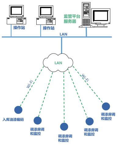 設(shè)計(jì)油漆調(diào)和監(jiān)管系統(tǒng),由監(jiān)管平臺(tái)服務(wù)器、油漆調(diào)和操作監(jiān)控終端、電子枰、油漆編碼終端、操作站等構(gòu)成,通過(guò)工廠內(nèi)的局域網(wǎng)(WI-FI)進(jìn)行通信連接。