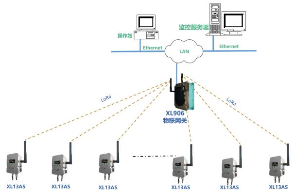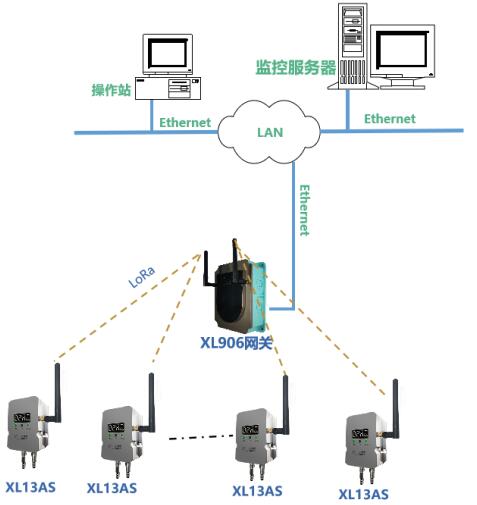 方案一:根據(jù)現(xiàn)場(chǎng)實(shí)際情況,部署XL906物聯(lián)網(wǎng)關(guān),XL13AS無(wú)線風(fēng)管風(fēng)速傳感器通過(guò)LoRa無(wú)線傳輸數(shù)據(jù)至XL906物聯(lián)網(wǎng)關(guān),網(wǎng)關(guān)可選Ethernet、Wi-Fi、4G等多種方式將風(fēng)速數(shù)據(jù)傳輸至監(jiān)控平臺(tái)。