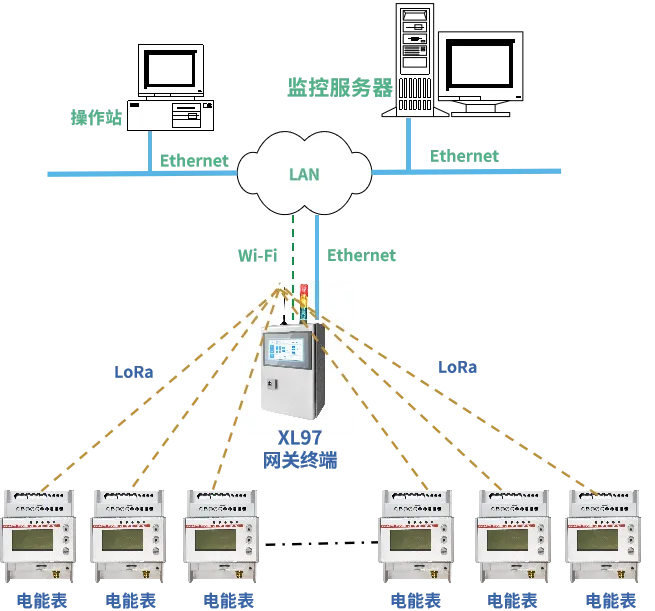 DTSD3366D/XL系列三相電子式電能表,通過(guò)LoRa無(wú)線傳輸電流數(shù)據(jù)至XL97網(wǎng)關(guān)終端,可實(shí)現(xiàn)就地監(jiān)控;XL97網(wǎng)關(guān)終端通過(guò)Ethernet或Wi-Fi推送數(shù)據(jù)至監(jiān)控平臺(tái),實(shí)現(xiàn)遠(yuǎn)程監(jiān)控。