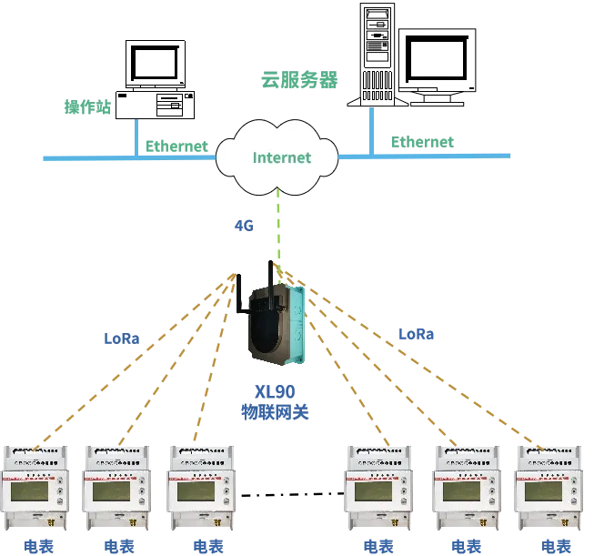 DTSD3366XL無線多功能電表獲取數據,通過LoRa無線傳輸方式上傳至XL90網關;XL90網關計算分析讀取的能耗數據,并通過4G無線通信方式,將數據上傳至監(jiān)控平臺。