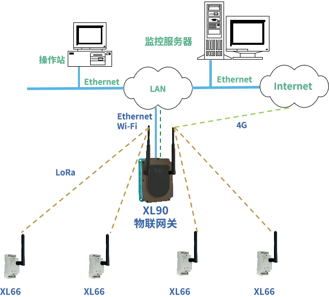 XL66串口無線轉換模塊通過LoRa將數(shù)據(jù)無線傳輸至XL90物聯(lián)網(wǎng)關,網(wǎng)關通過以太網(wǎng)、Wi-Fi上傳數(shù)據(jù)至監(jiān)控平臺、PLC、觸摸屏、控制器等設備,或通過4G無線上傳數(shù)據(jù)至云平臺。
